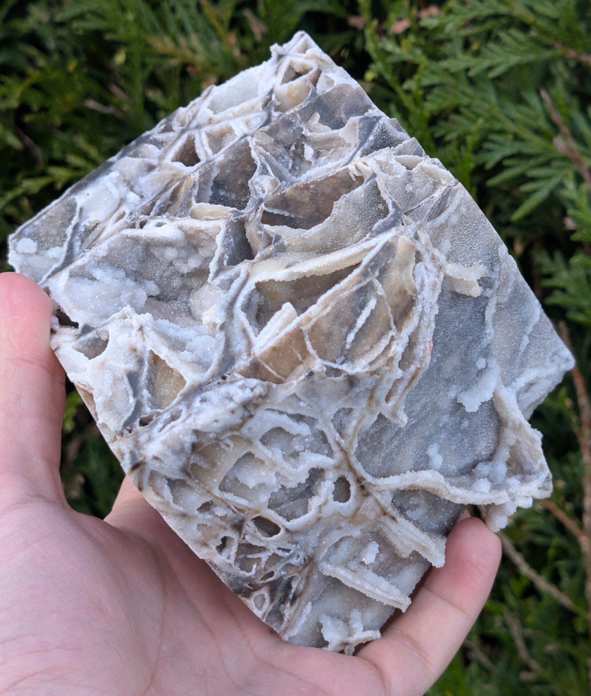 Aspect : Bloc poli sur les faces extérieures, cavités cristallisées naturelles à l'intérieur