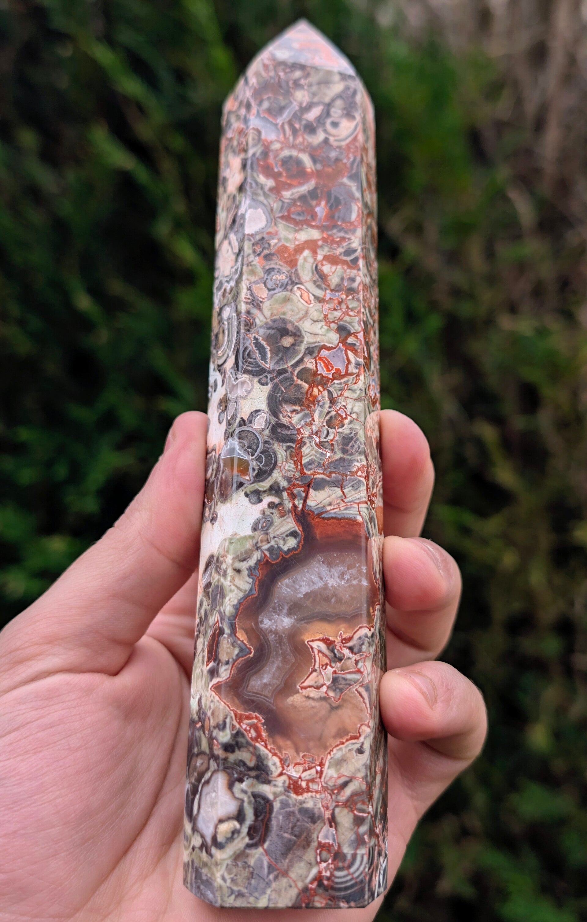 Une Œuvre d'Art Géologique : Le Jaspe Léopard est une pierre fascinante par la complexité de ses dessins. Formé par des processus volcaniques, il présente des inclusions circulaires (orbes) aux teintes terreuses qui semblent avoir été peintes à la main. Cette tour a été taillée pour offrir une verticalité élégante, mettant en valeur la continuité de ses motifs sur chaque face.